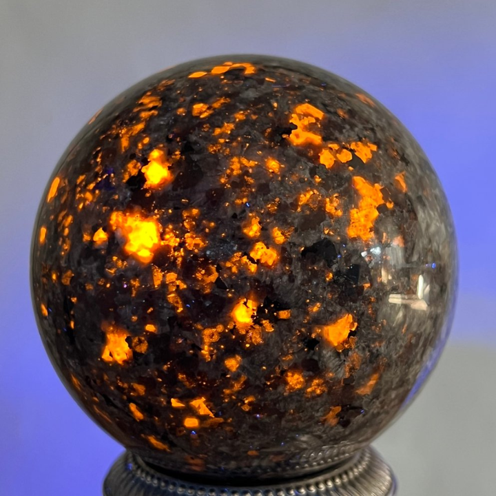 Uncover the rare and captivating magic of the Yooperlite Sphere — a crystal that appears mysterious in the light but comes alive under UV, glowing with fiery orange and gold luminescence like embers beneath the surface. Each sphere is a natural masterpiece, weighing 330g+ and completely unique in its markings and glow.